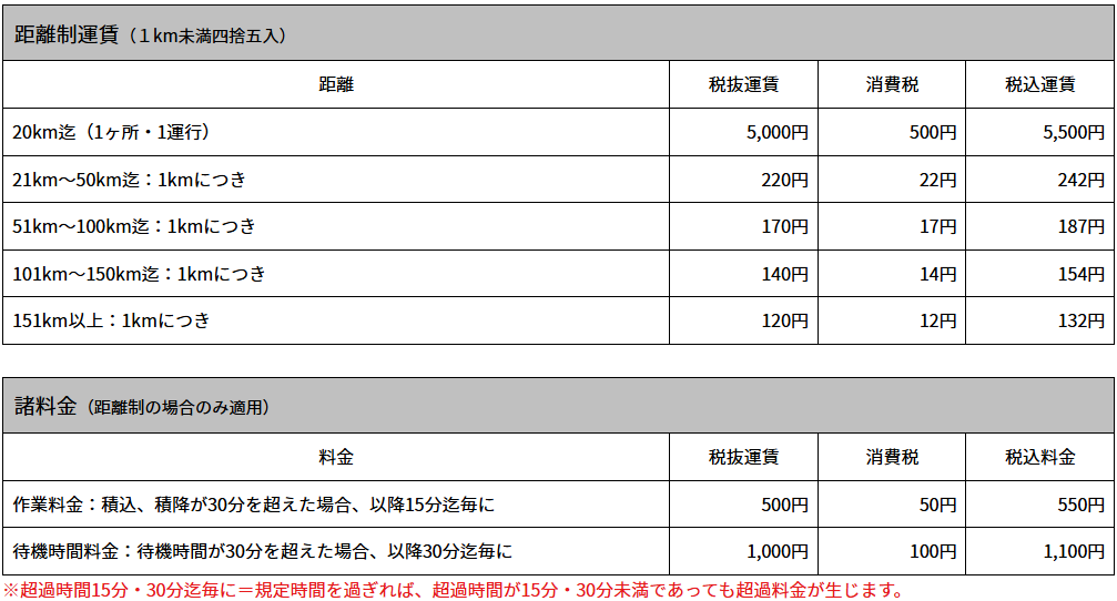 20kmを越えると1km毎に料金が加算されます。料金は上記の表を参考にしてください。